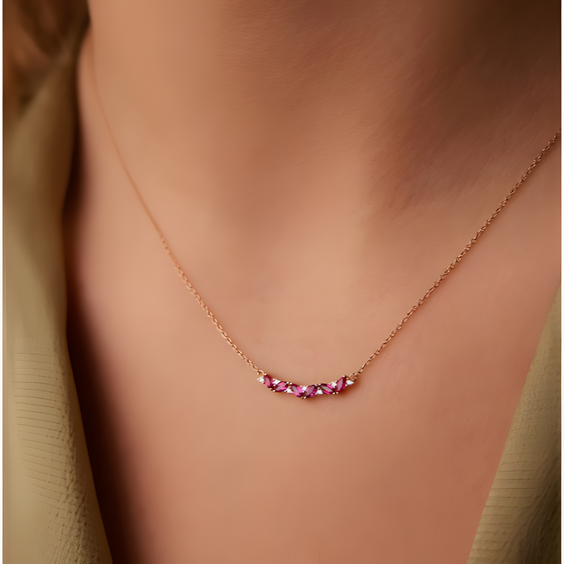 Adorn yourself in luxury with our Radiant Ruby Marquise Necklace. Each marquise-cut ruby dazzles with vibrant color and elegance, set in a delicate golden chain that enhances its allure. This necklace is perfect for those who appreciate the timeless allure and sophistication of ruby gemstones, making every moment feel extraordinary.